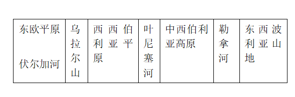 2)海陆位置:位于亚欧大陆北部,北临北冰洋,东临太平洋,西濒波罗的海,东北隔白令海峡与北美洲相望;陆上与芬兰、白俄罗斯、乌克兰、哈萨克斯坦、中国、蒙古、朝鲜等国为邻。3.俄罗斯是跨亚、欧两洲的欧洲国家,但传统上被视作的欧洲国家4.地形以平原为主,西部平原为主,东部多高原、山地。从西向东分布的主要地形区和主要河流是: